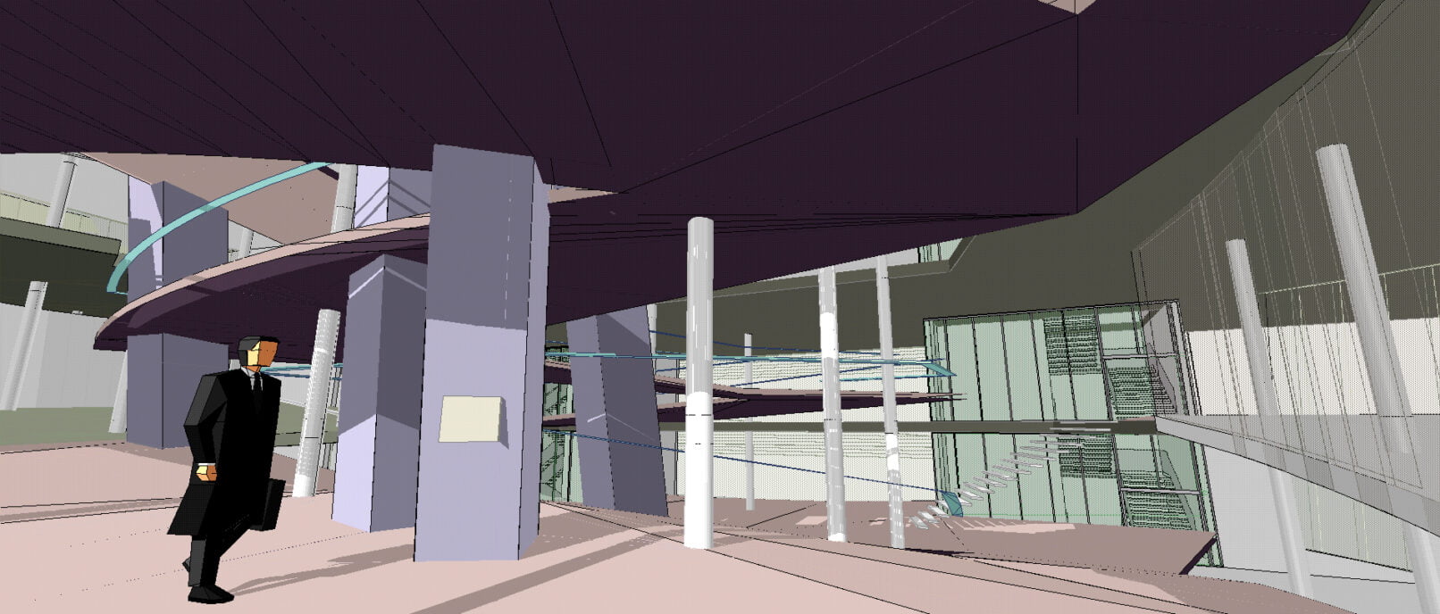 - Słupy informacji multimedialnej. Symbolizują swą przecinającą budynek formą wszechogarniające linie globalnej sieci informacyjnej. Zawierają w sobie interfejsy stanowisk informacyjnych i elektronicznych katalogów. Oprócz tego zawierają w sobie piony kanałów klimatyzacyjnych.