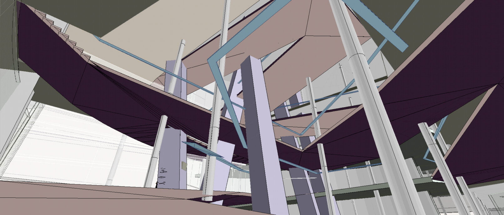 - Siatka słupów konstrukcyjnych, spina budynek stanowiąc główną strukturę konstrukcyjną. Oparta na module 7,2m x7.2m i 7,2m x 4,8m