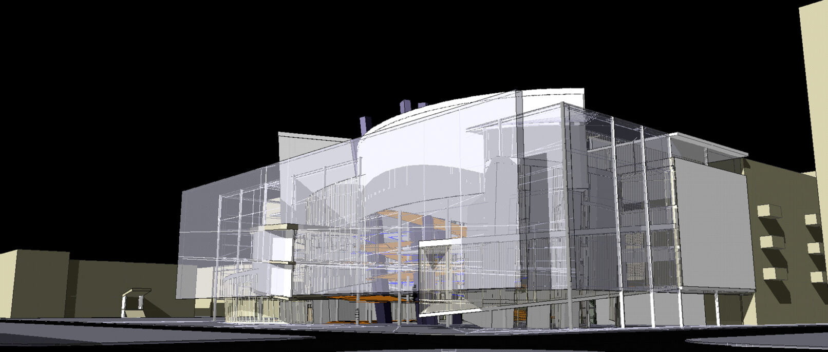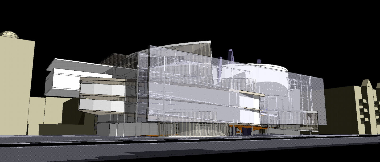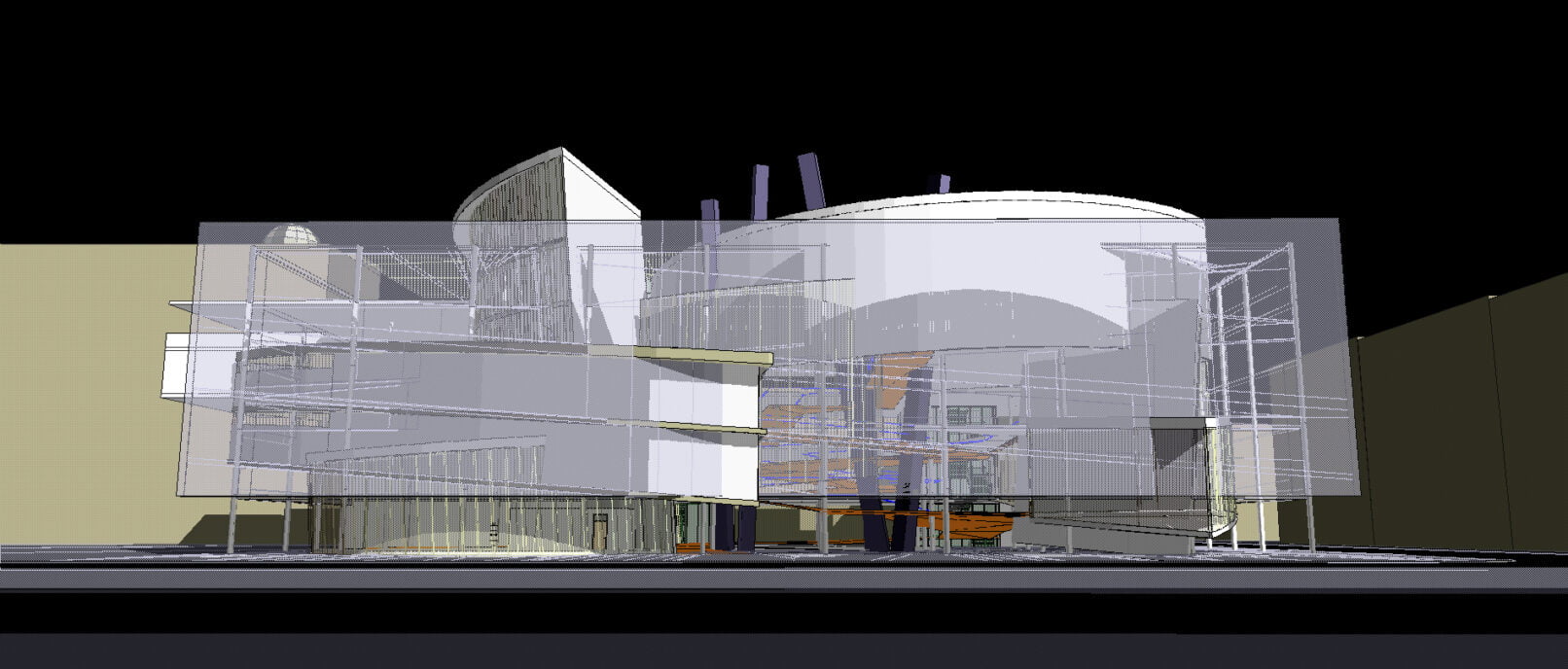 - „akwarium” – przezroczysta obudowa w której zamknięte są bryły agend biblioteki. Pełni funkcje osłony akustycznej, oraz przez zastosowanie systemów podwójnej ściany osłonowej pozwala sterować mikroklimatem budynku. Systemy wywietrzników i żaluzji dają możliwość sterowania nagrzewaniem budynku i penetracją słońca. Podwójna skóra chroni przed wychładzaniem w okresie zimowym.