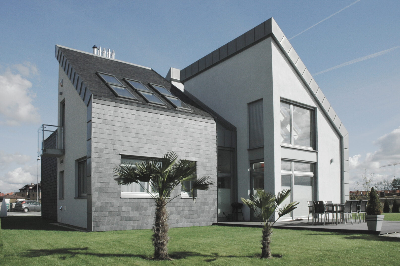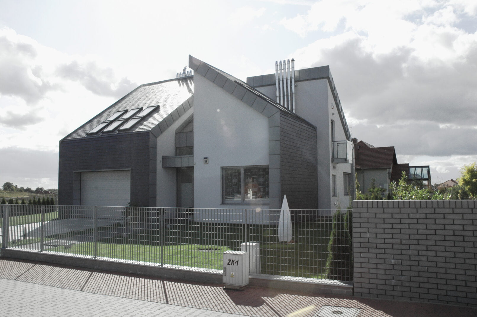 Zaprojektowano budynek jednorodzinny o rozrzeźbionym układzie przestrzennym. Przyjęto następujące założenia: czytelny podział funkcjonalny uwidoczniony w formie budynku, atrakcyjne jednoprzestrzenne wnętrze o nowoczesnym charakterze, maksymalne doświetlenie światłem naturalnym, pogodzenie nowoczesnego charakteru budynku z wymogiem zastosowania dachu stromego. W efekcie powstał budynek złożony z czterech rozsuniętych względem siebie prostopadłościanów przykrytych dachami jednopołaciowymi ustawionymi prostopadle względem siebie, połączonych przeszklonym dachem w kształcie ostrosłupa spajającym budynek w całość, przekrywającym jednoprzestrzenny hall z lekkimi schodami i kładkami zawieszonymi nad parterem.