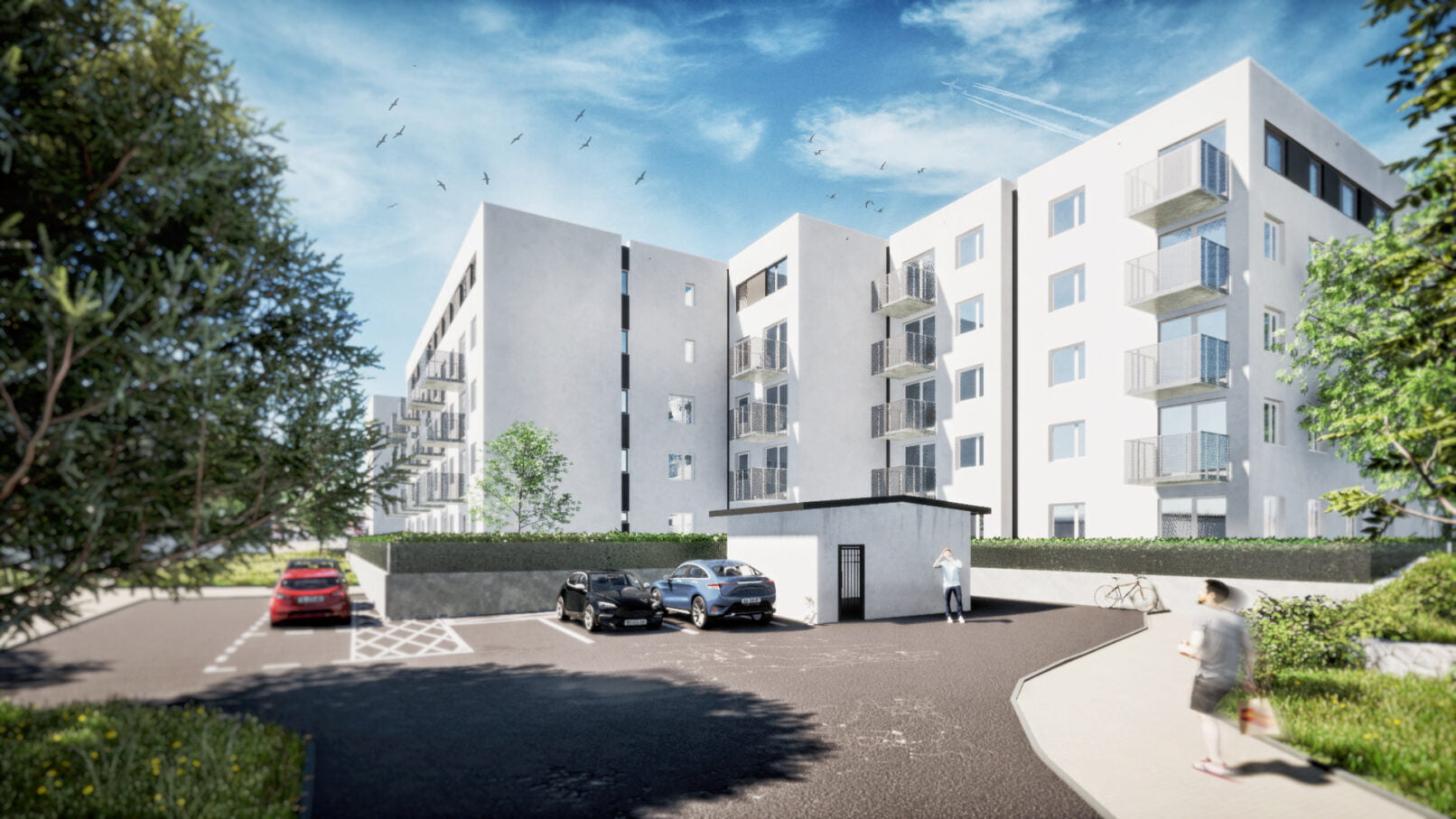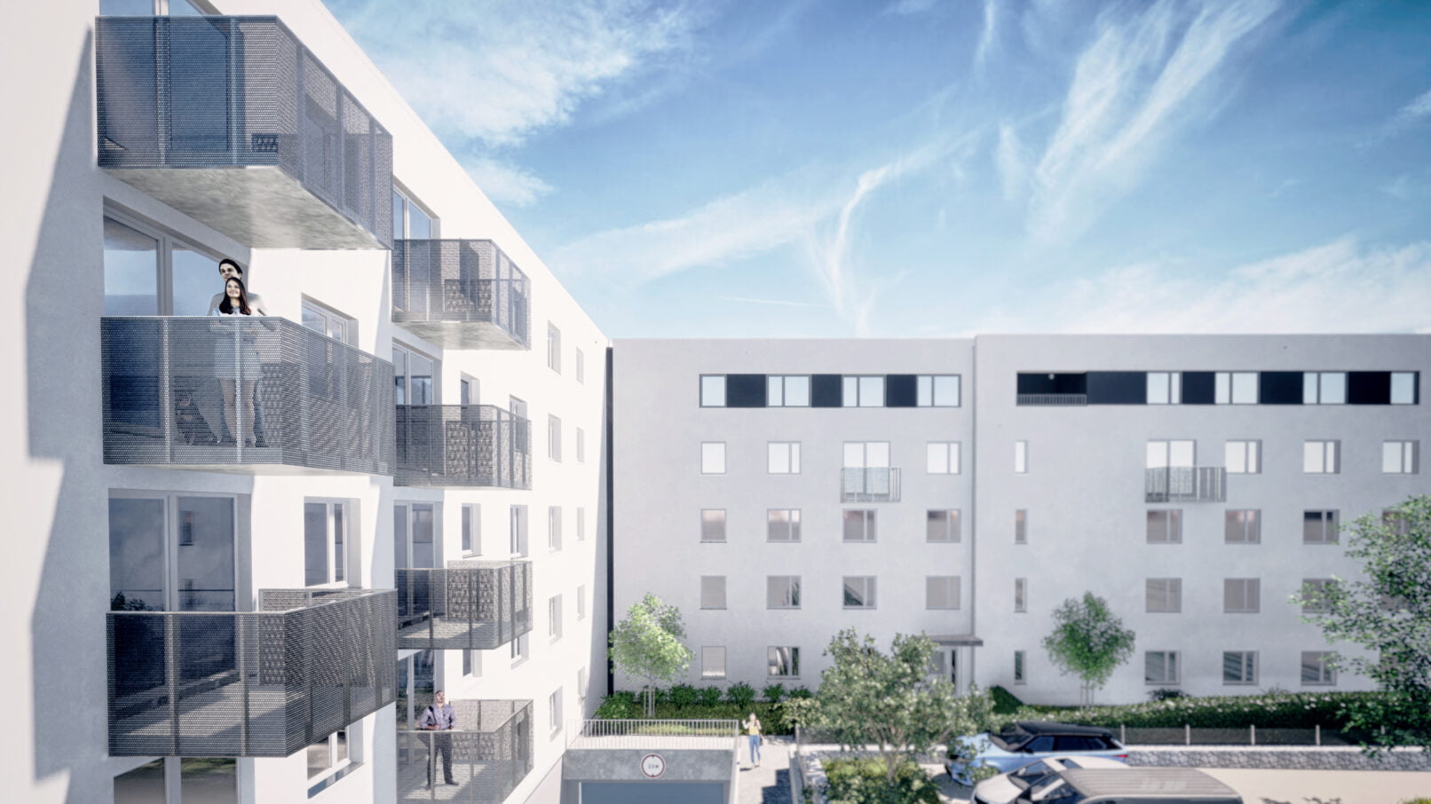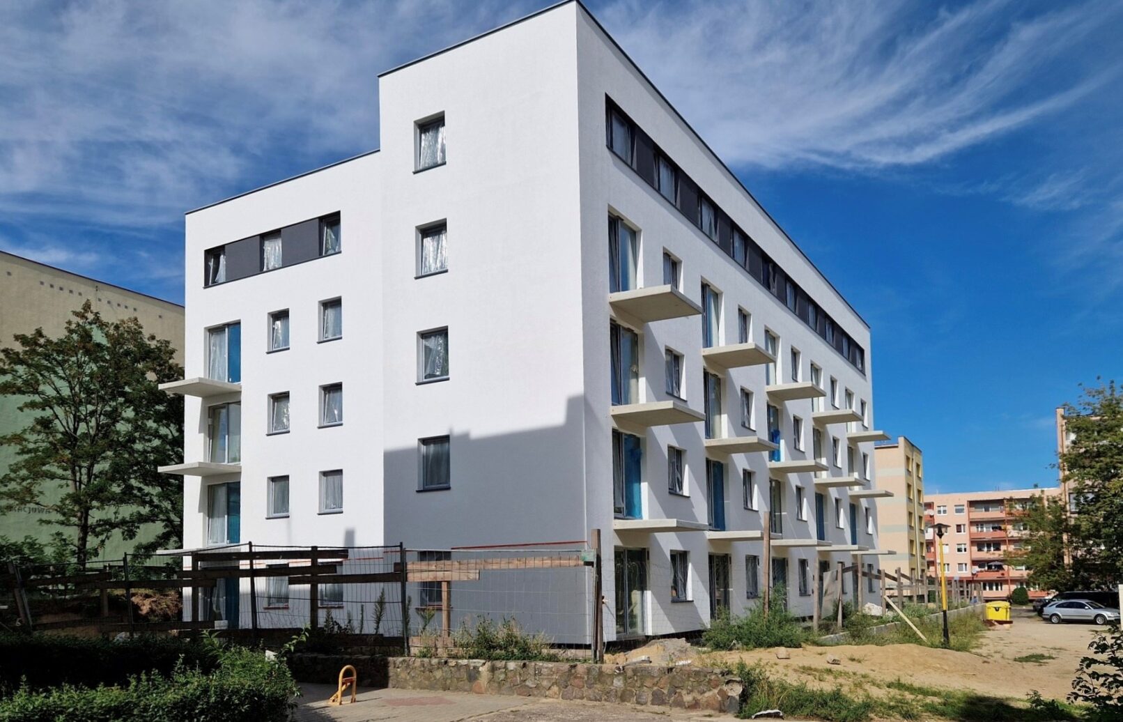 Zabudowę ukształtowano tak by zachować maksymalnie kontakt z otoczeniem. Większość mieszkań na parterze posiada bezpośrednie wyjścia na teren w formie „przedogródków”