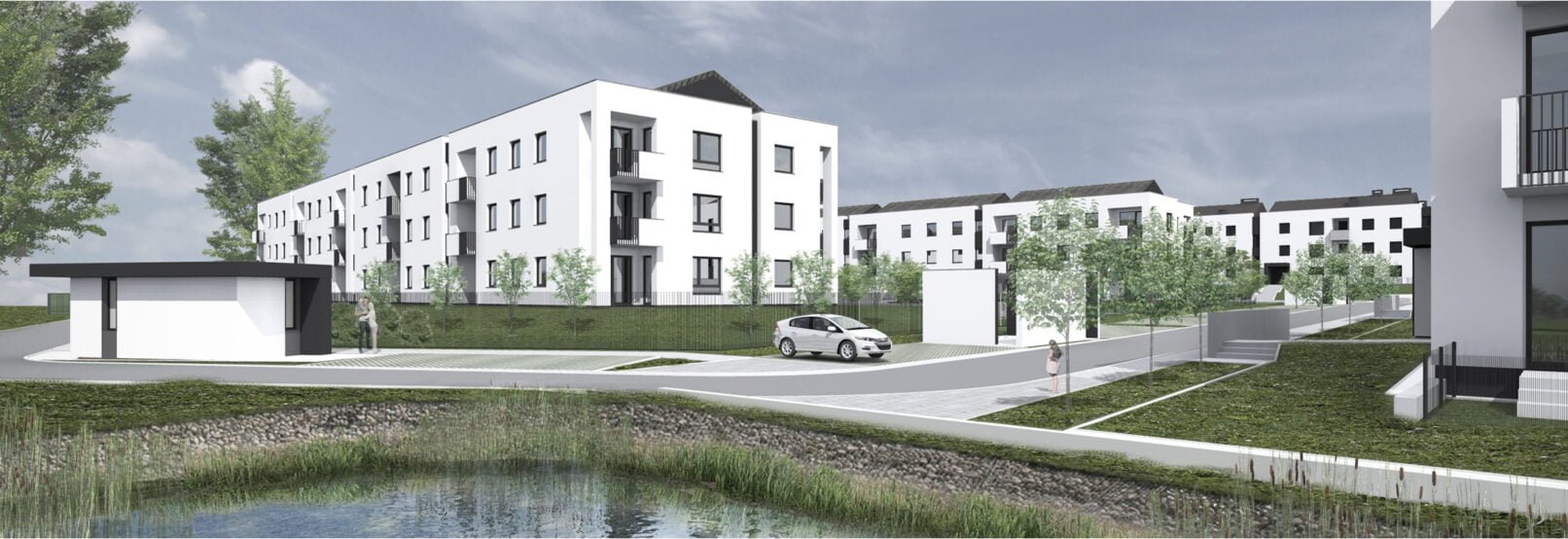 Projektowane budynki odwołując się swoim charakterem do wzorców modernistycznych składają się z trzech pełnych kondygnacji mieszkalnych. Mieszkania na parterze przypisane mają ogródki przydomowe.